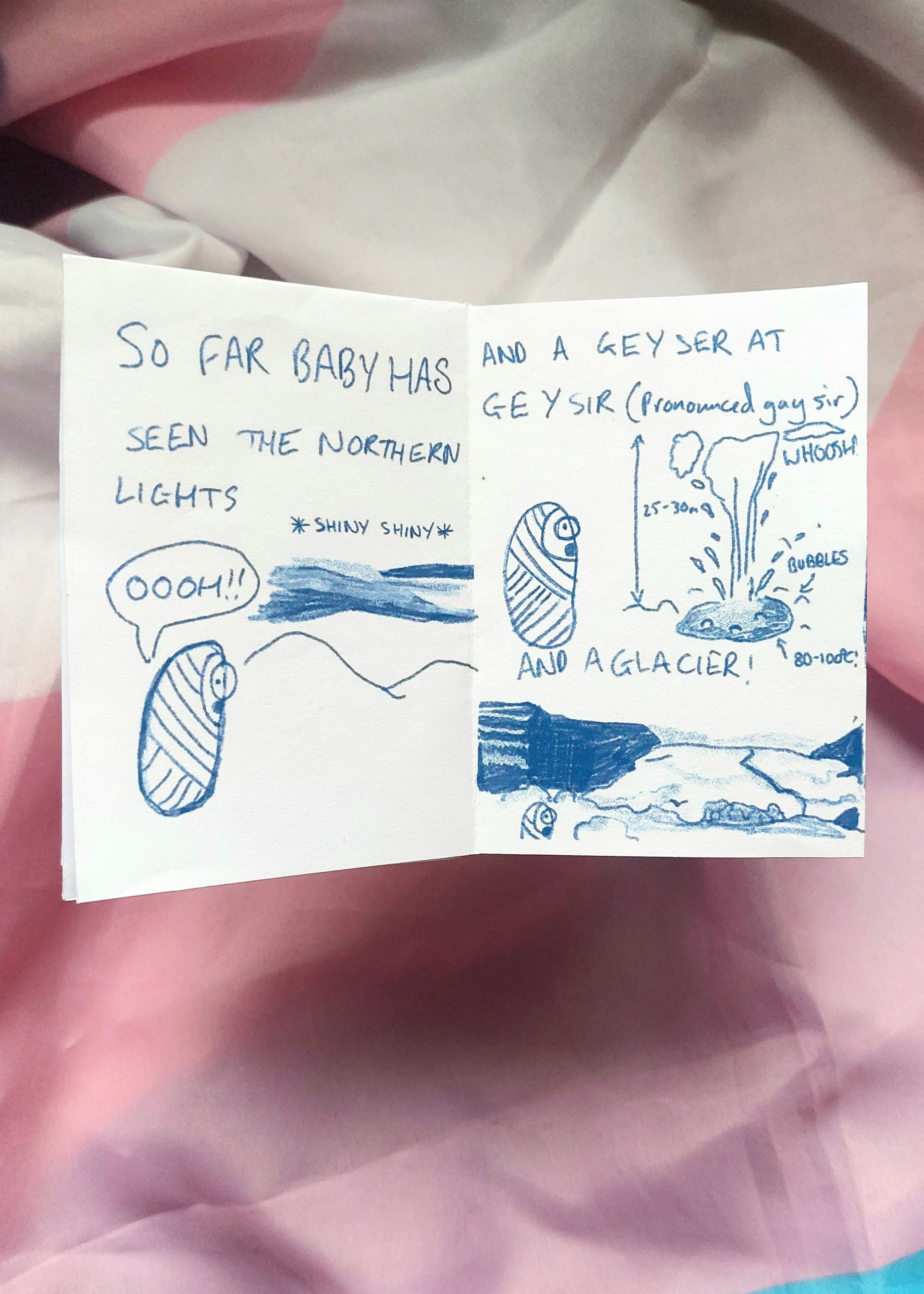 An 8-page zine originally drawn on one sheet of A4 all about my travels in Iceland through the eyes of Baby, a character based on me because I’m a massive wuss
