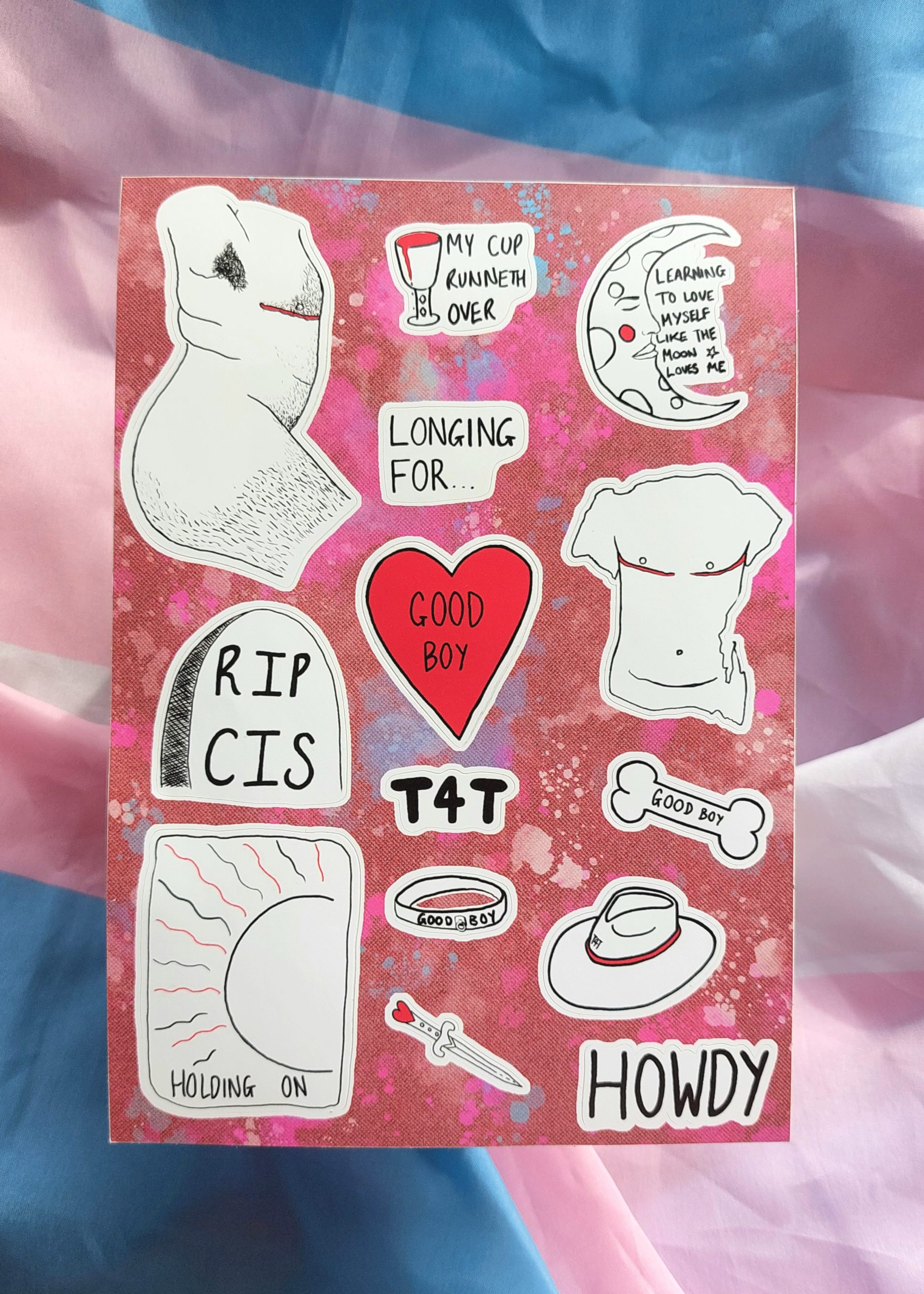 Show your trans joy and love of all things trans masc with this A5 sticker sheet. This sheet is A5 size featuring 14 unique stickers not available anywhere else!